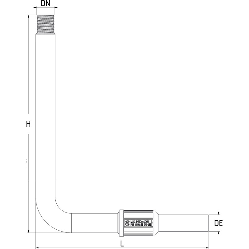 Raccor de transición PE/acciaio curvo conterminal roscado (versión personalizabledel art.002). Realizado por medio de moldeo por inyección, se emplea para la conexión de varios materiales (uno de los cuales debe ser polietileno) en instalaciones de tuberías para el transporte de gas combustible.